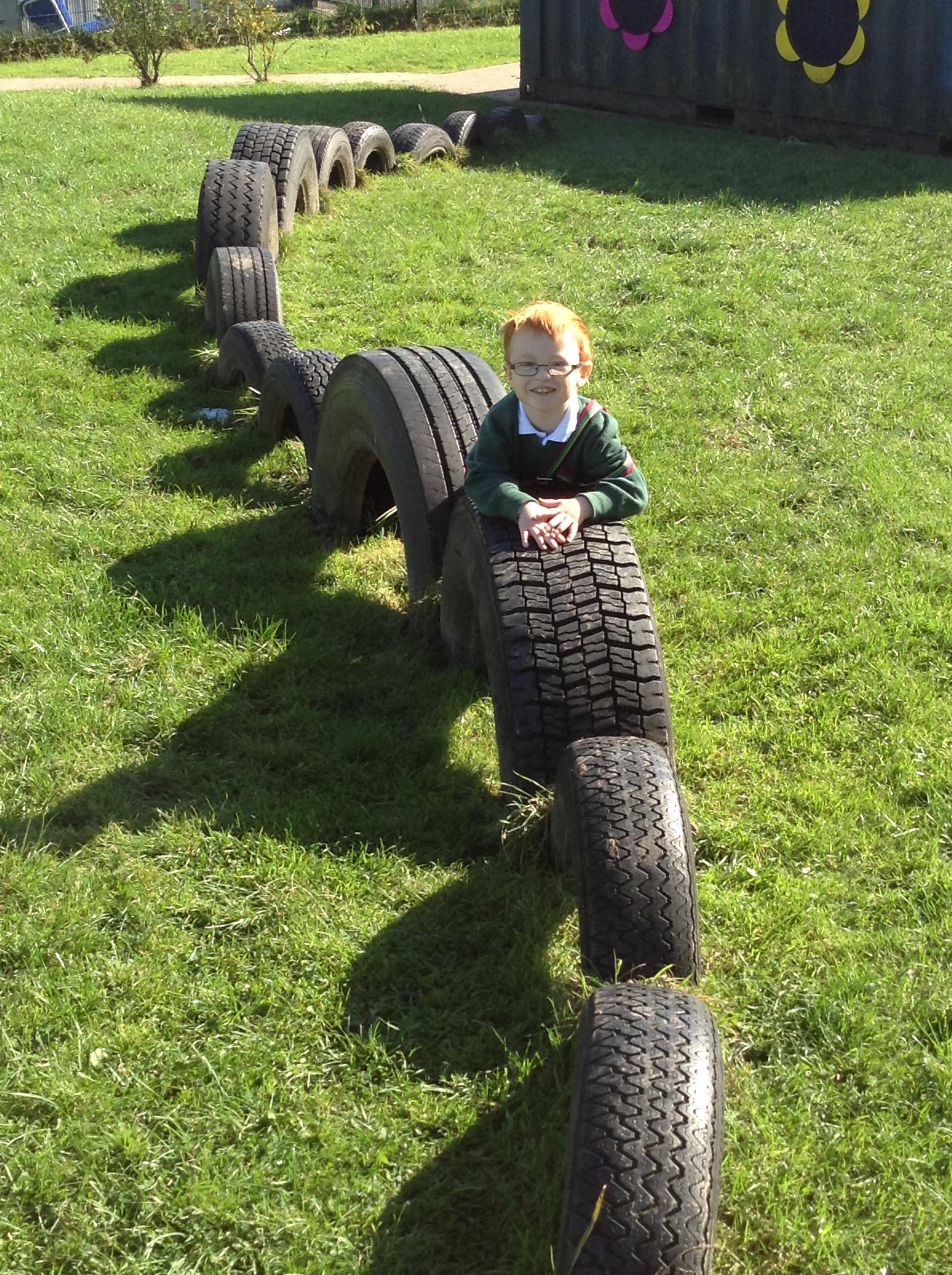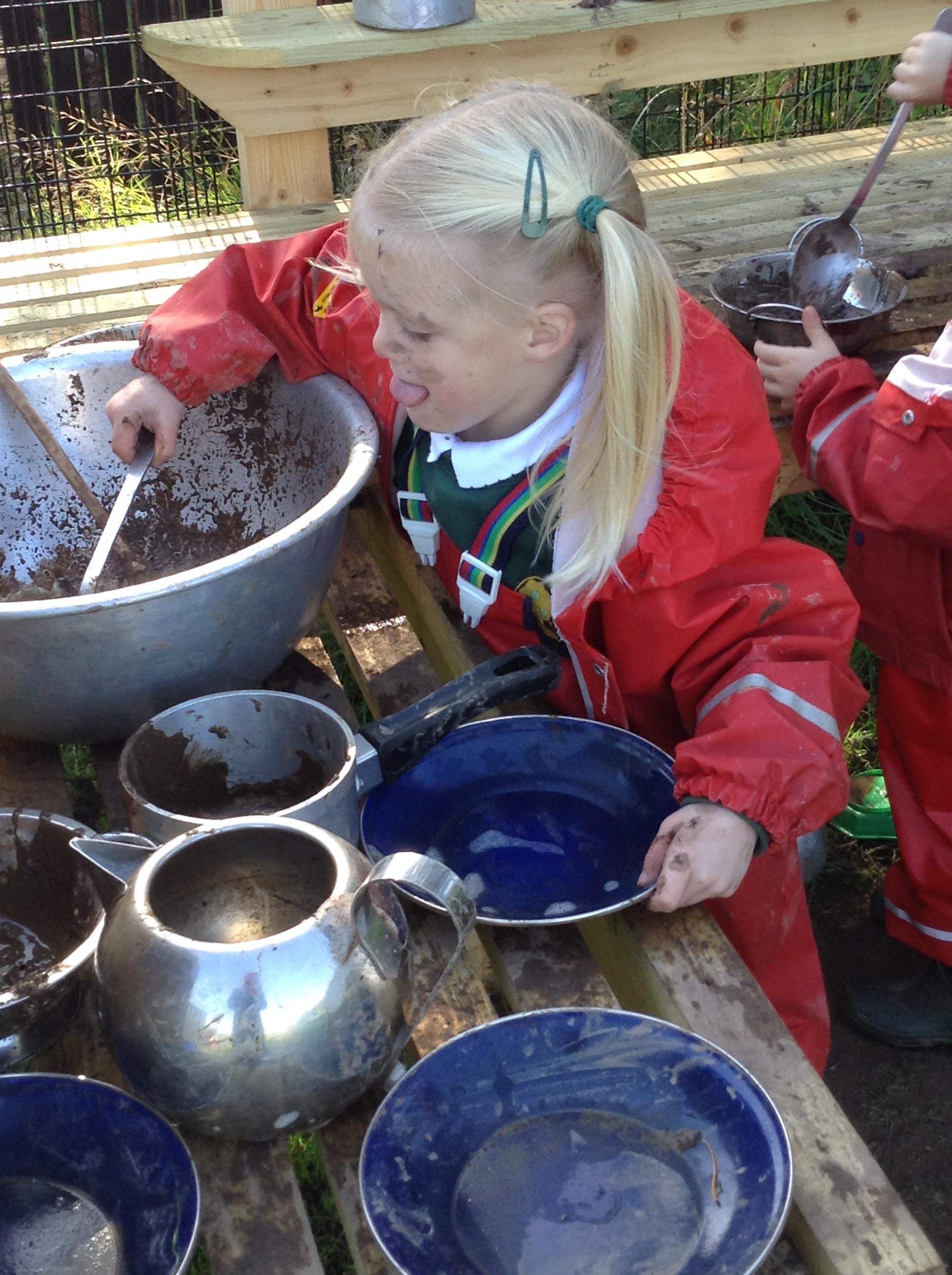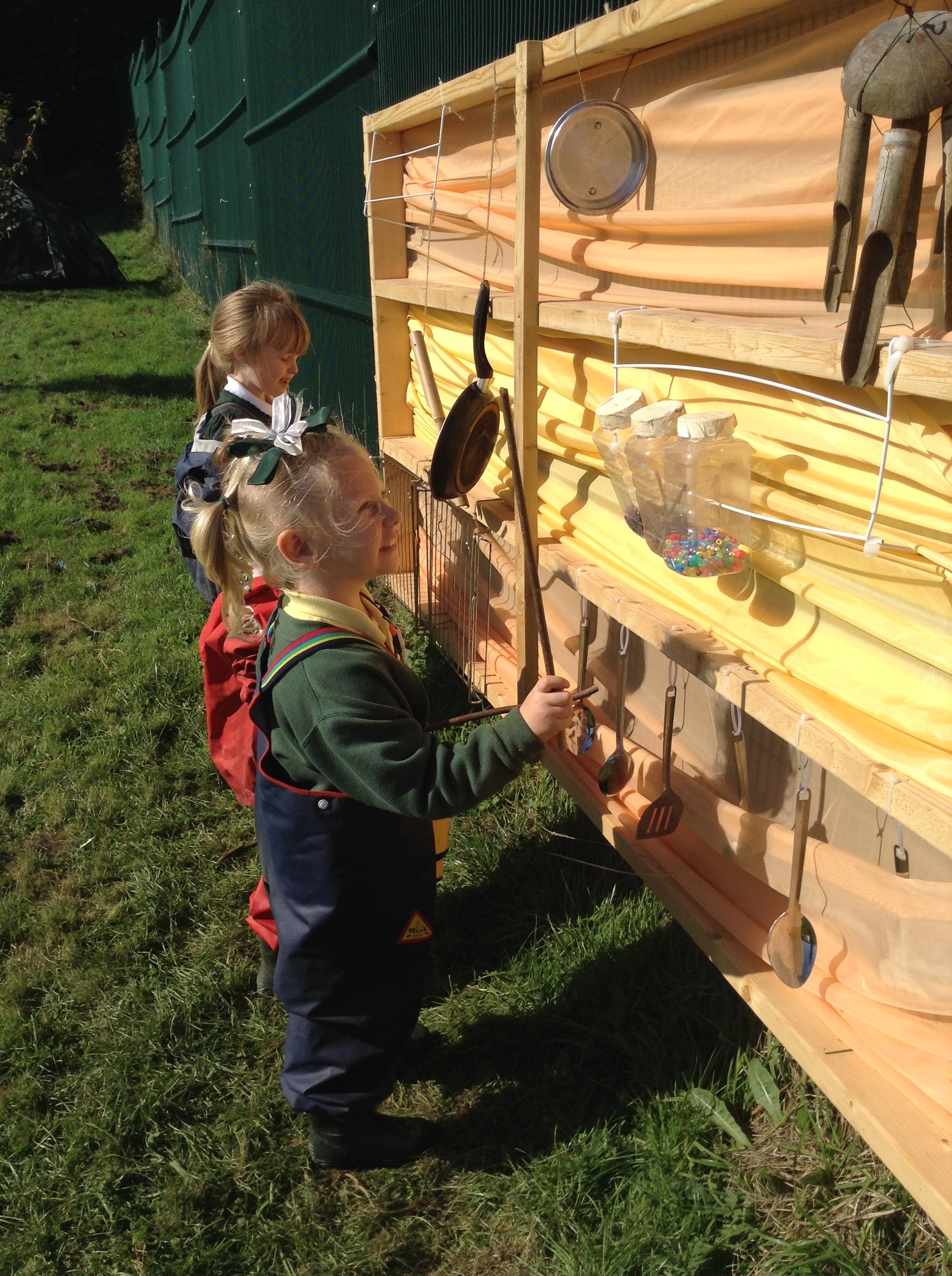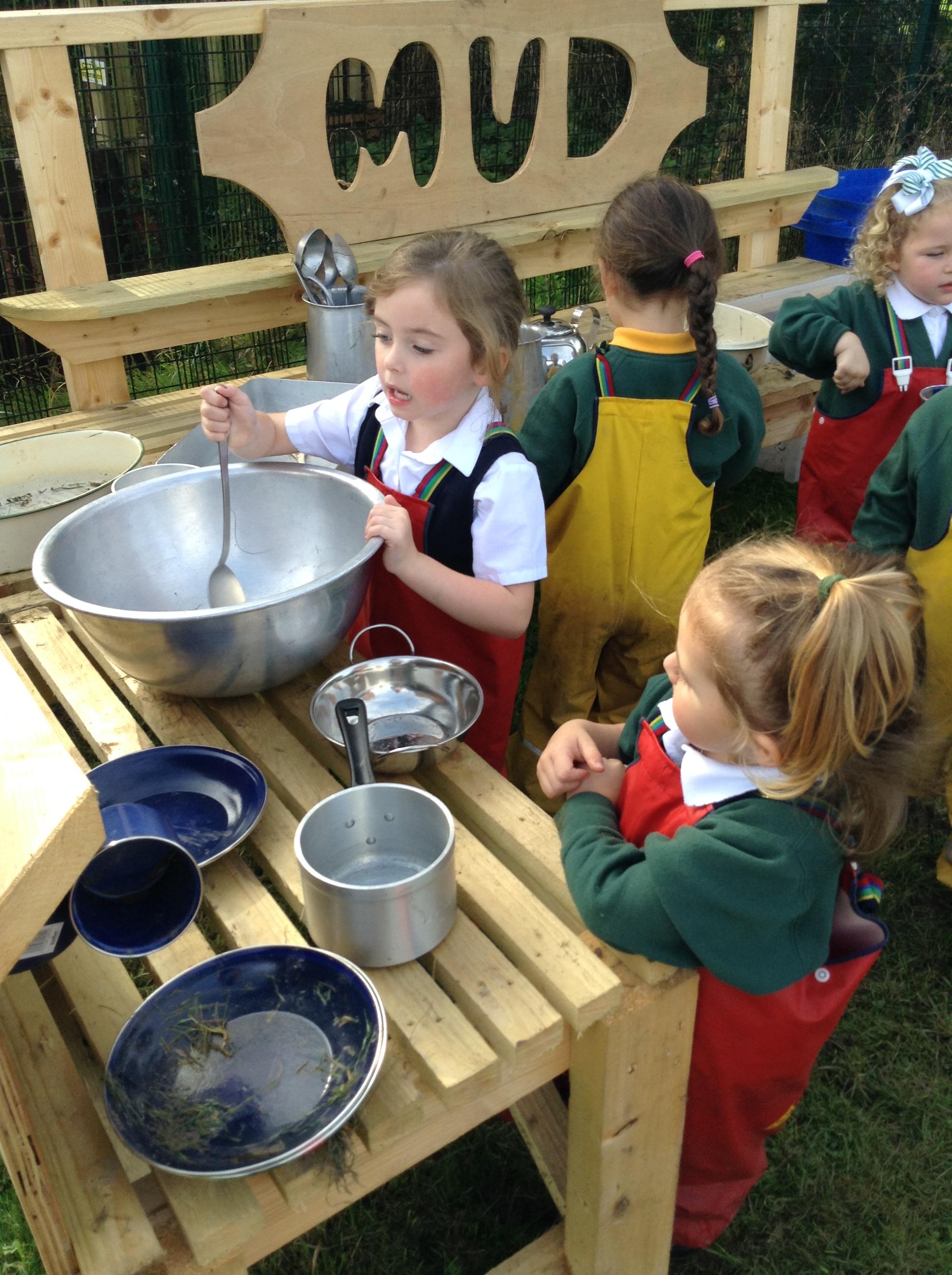 The outdoor play area is available for children to use when they are accessing continuous provision. The activities mirror those taking place indoors, on a larger, noisier and sometimes messier scale!